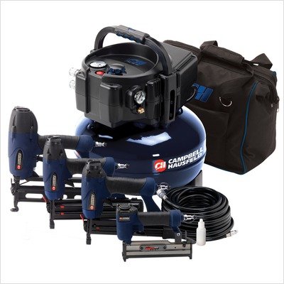 MW250096AV Tackle your fastening projects faster and easier with this 6 gallon compressor with 4 nailer kit. It includes all the tools and accessories you need to get started on your finish and trim jobs, such as installing crown molding, chair rail, window casings, baseboards and more. The kit includes a finish nailer for installing molding and building furniture and a brad nailer for installing window and door trim. It also includes a crown stapler for installing cabinets and countertops and a pin nailer for adding decorative molding to furniture and crafts. This portable, oil-free compressor is easy to carry and easy to store. It s ideal for moving around the house to various projects and storing in your work area or garage. '' Features: -Ideal for finish and trim jobs such as crown molding, chair rail, window casings, baseboards and door jams; also perfect for car and bike tire inflation. -Includes 4 nailer kit: 2 inch 16 gauge finish nailer, 2 inch brad nailer, inch crown stapler, pin nailer . -Includes accessory kit so you can get started right away (staples, brad nails, pins, nailer oil, hex wrenches, 50 ft PVC air hose and storage bag). -Great value 5 retail value if purchased separately. -Easy to carry and easy to store portable, compact compressor design . -Low maintenance oil-free compressor. -Easy-to-read gauges for quick monitoring of air pressure . -Campbell Hausfeld has been making it easy to do it like a pro for 175 years. -Choose air power for versatility, value and power save time and money using this portable air compressor for inflating and fastening. Specifications: -Includes two inch couplers and easy-to-use regulator with soft touch knob. -3.9 SCFM @ 40 PSI. -2.6 SCFM @ 90 PSI. -Max 150 PSI. -20 volt.